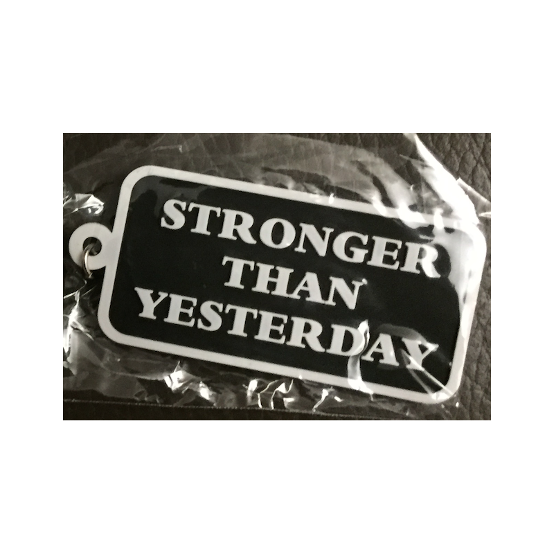 Porte-clé noir en plastique souple, avec sigle blanc "Stronger than yesterday", vendu sur la tournée européenne Piece Of Me 2018.