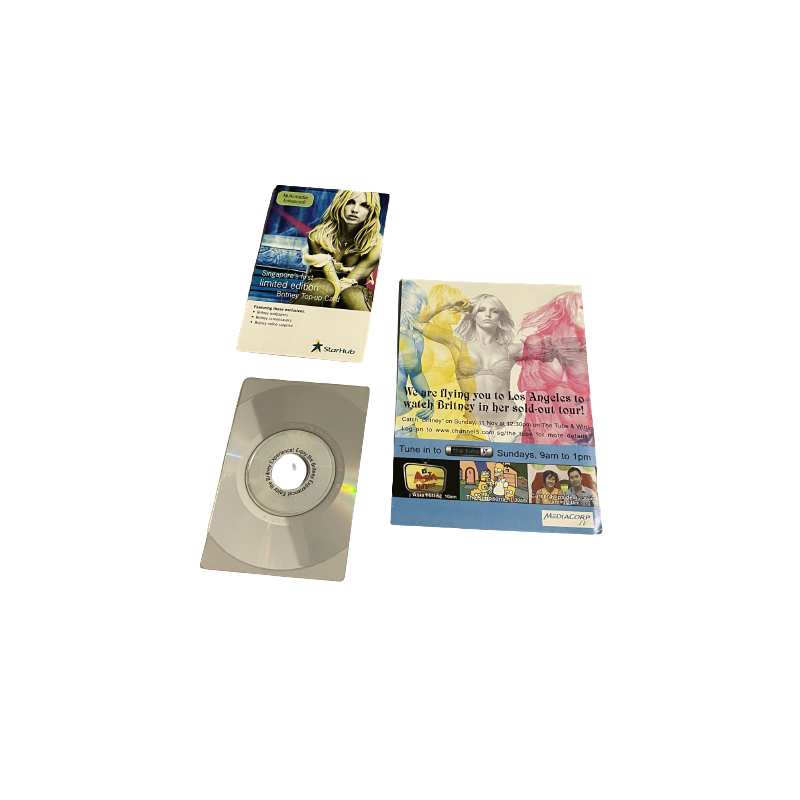 Kit top up "Britney" (Singapour). Carte de rechargement pour téléphone portable. Inclus : un mini-disc incluant économiseur d'écran, fonds d'écrans et contenus digitaux.