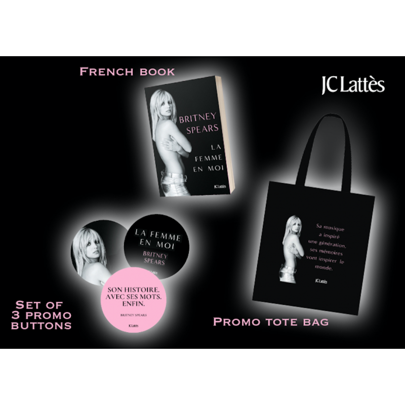 Lot promo "La Femme en moi" - livre + badges + sac en tissu (France).