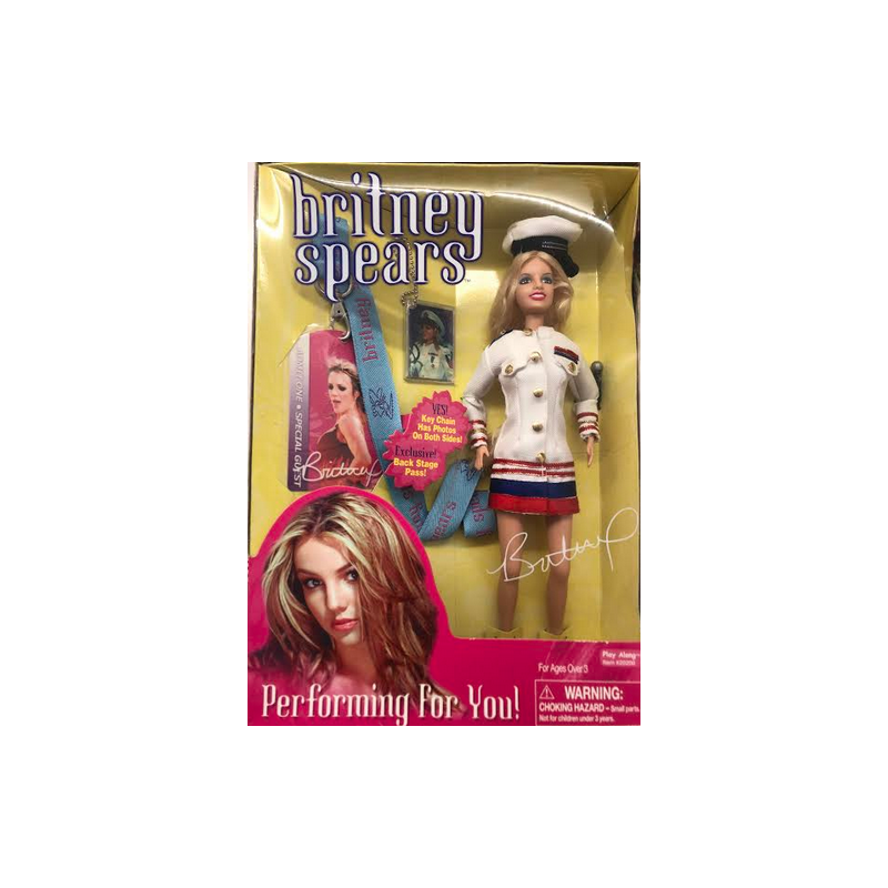 Poupée Britney Spears (modèle n°20), inspirée de la tenue portée par Britney Spears sur scène. Taille approximative : 25cm. Inclus ses accessoires et un pass backstage.