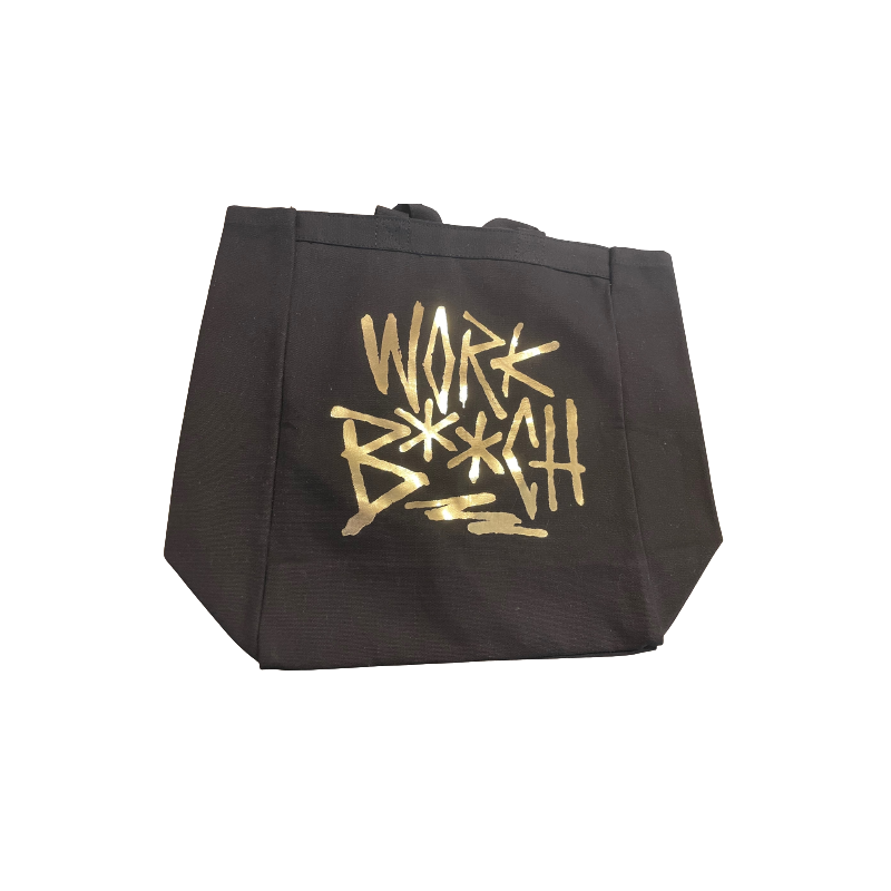 Sac en tissu "WORK BITCH" or brillant (USA). Commercialisé à Las Vegas lors de la résidence Piece Of Me.